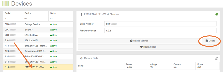 IMPORTANT: Removal of a Device will NOT automatically purge the data for the Device and its sensors. To delete collected data, please contact Support.