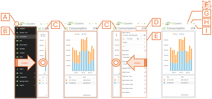 Navigating MyEyedro mobile is similar to navigation of the non-mobile interface. The MyEyedro cloud service provides a mobile-friendly experience for users who prefer to access their accounts from their smartphones or other small screen devices.
